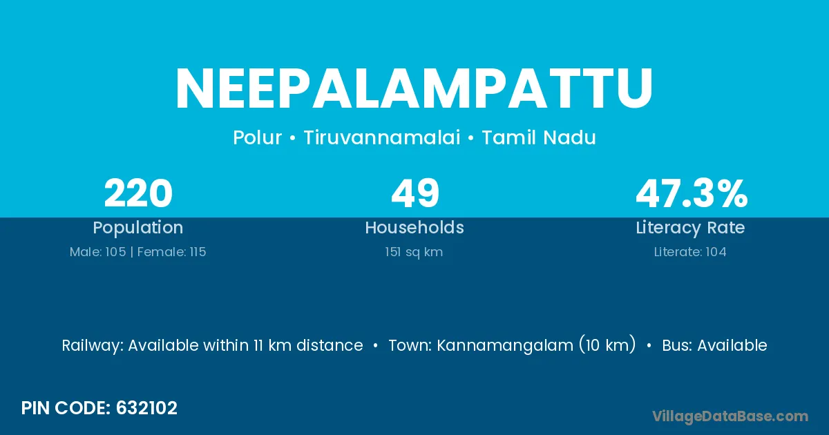 Neepalampattu village has a total population of 220 people, of which 105 are males and 115 are females.