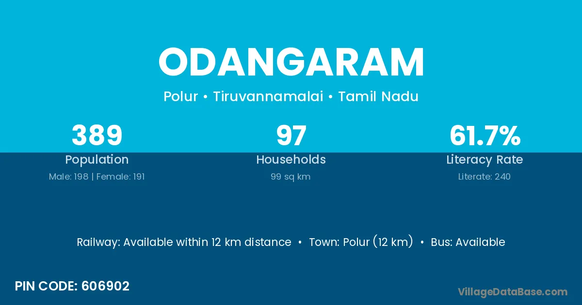 Polur (12 km) is the nearest town to Odangaram village for major economic activities and is located approximately 12 km away.