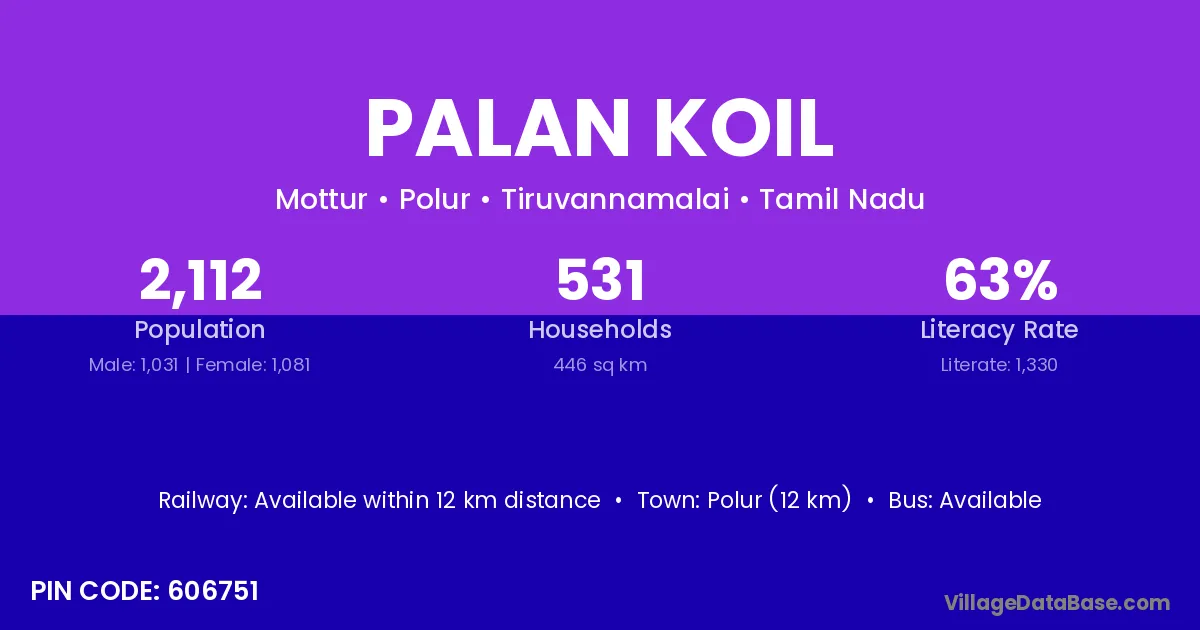 Polur (12 km) is the nearest town to Palan Koil village for major economic activities and is located approximately 12 km away.