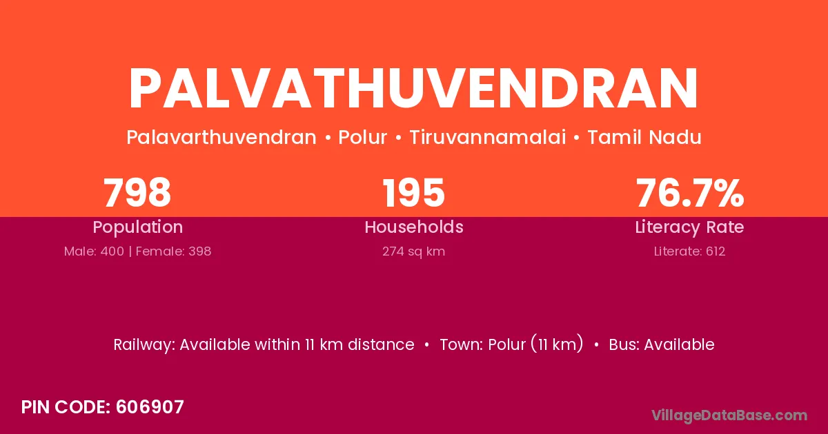 Polur (11 km) is the nearest town to Palvathuvendran village for major economic activities and is located approximately 11 km away.