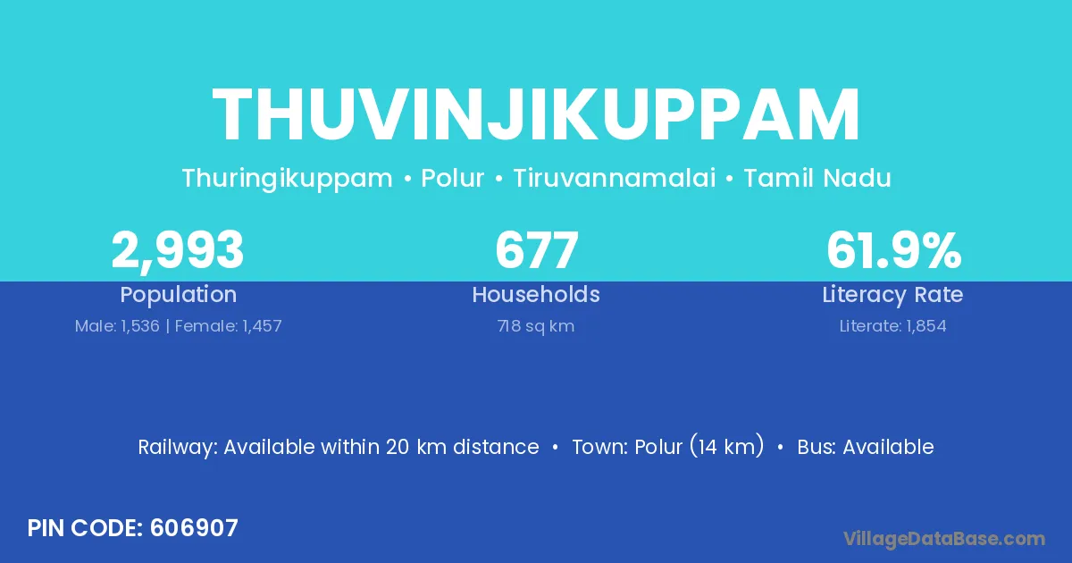 Polur (14 km) is the nearest town to Thuvinjikuppam village for major economic activities and is located approximately 14 km away.