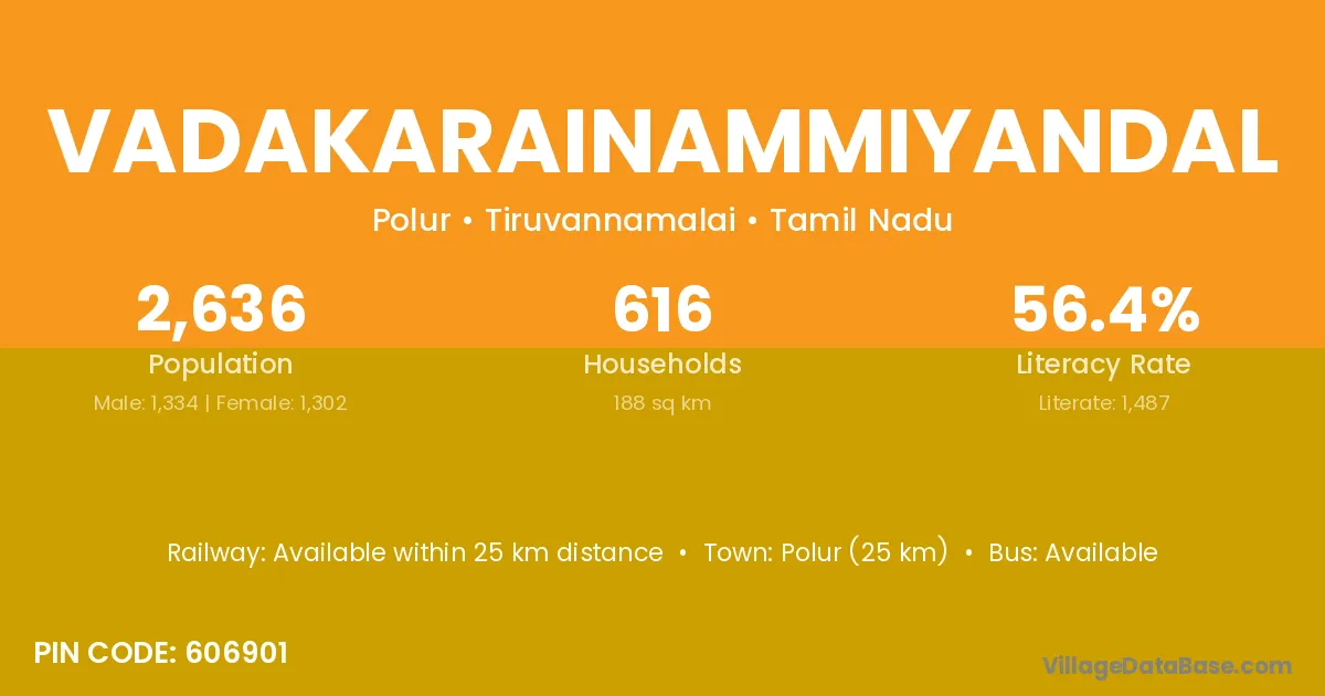 Polur (25 km) is the nearest town to Vadakarainammiyandal village for major economic activities and is located approximately 25 km away.