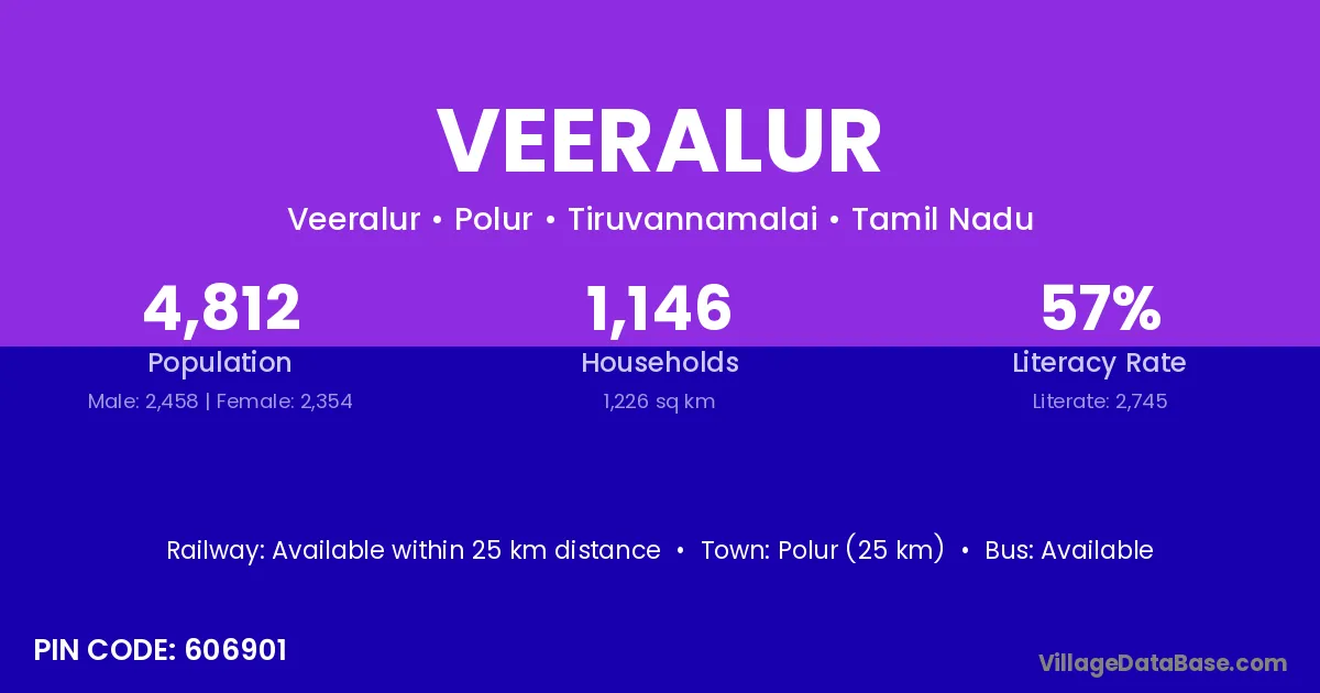 Polur (25 km) is the nearest town to Veeralur village for major economic activities and is located approximately 25 km away.
