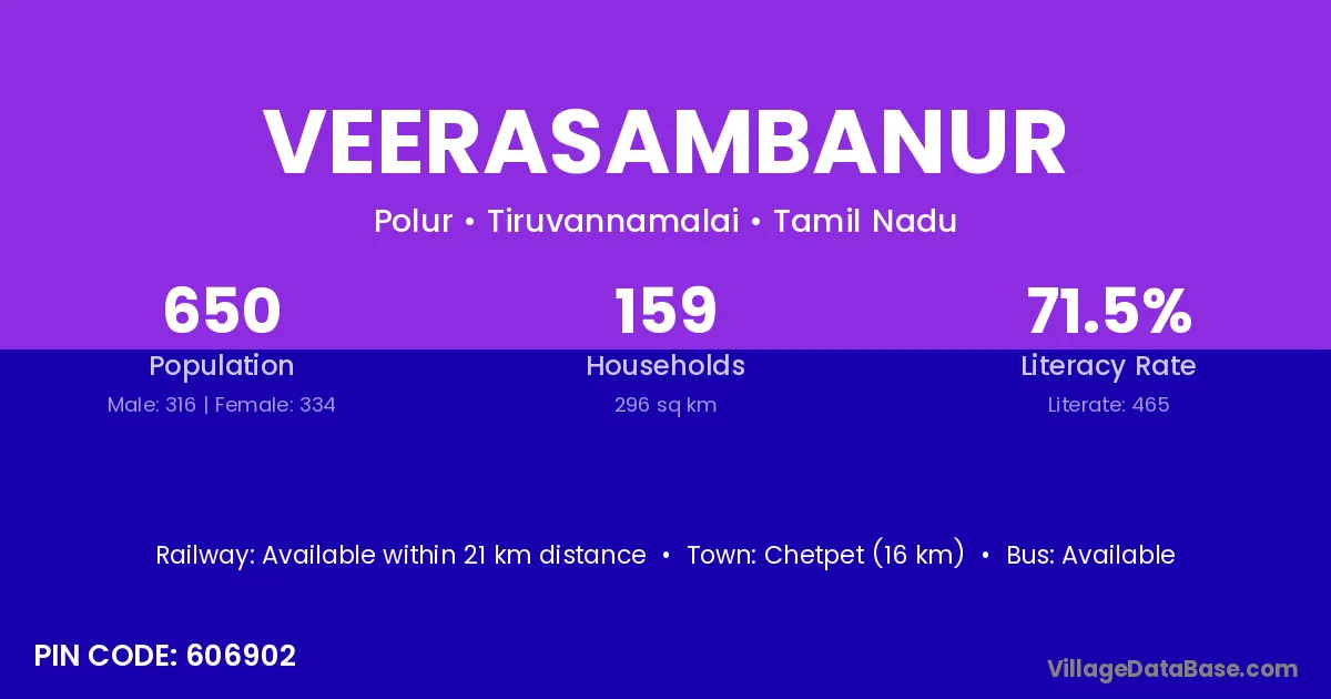 Chetpet (16 km) is the nearest town to Veerasambanur village for major economic activities and is located approximately 16 km away.