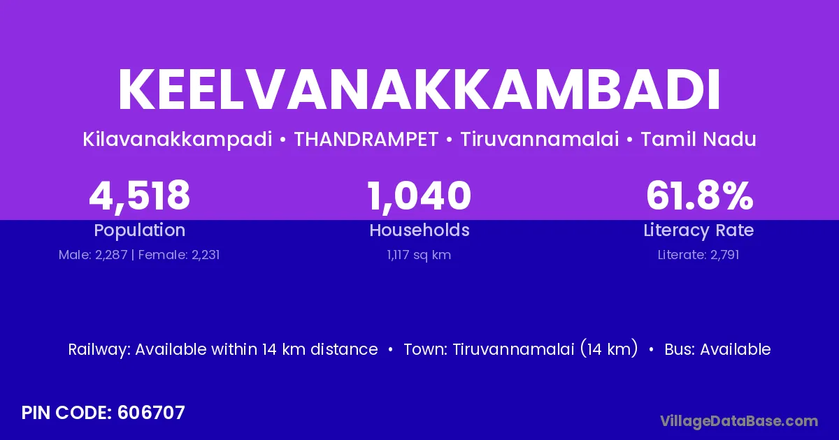 Tiruvannamalai (14 km) is the nearest town to Keelvanakkambadi village for major economic activities and is located approximately 14 km away.