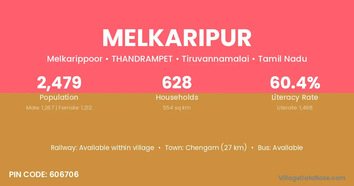 Chengam (27 km) is the nearest town to Melkaripur village for major economic activities and is located approximately 27 km away.