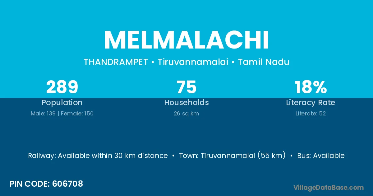 Tiruvannamalai (55 km) is the nearest town to Melmalachi village for major economic activities and is located approximately 55 km away.