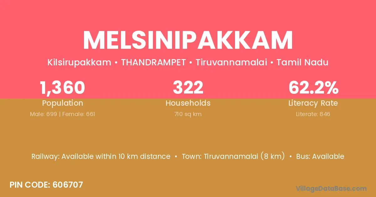 Melsinipakkam village has a total population of 1,360 people, of which 699 are males and 661 are females.