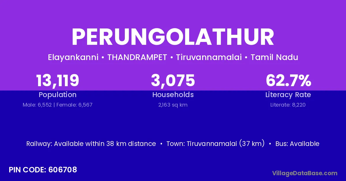 Perungolathur village has a total population of 13,119 people, of which 6,552 are males and 6,567 are females.