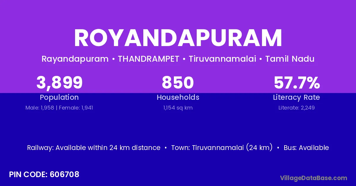Royandapuram village has a total population of 3,899 people, of which 1,958 are males and 1,941 are females.
