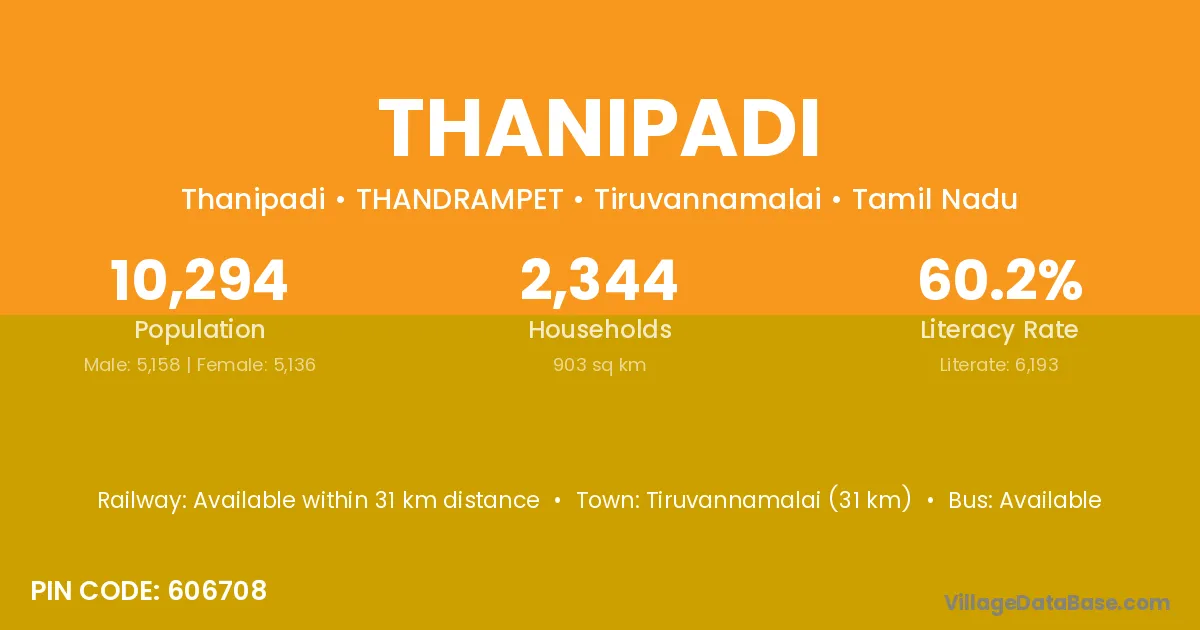 Tiruvannamalai (31 km) is the nearest town to Thanipadi village for major economic activities and is located approximately 31 km away.