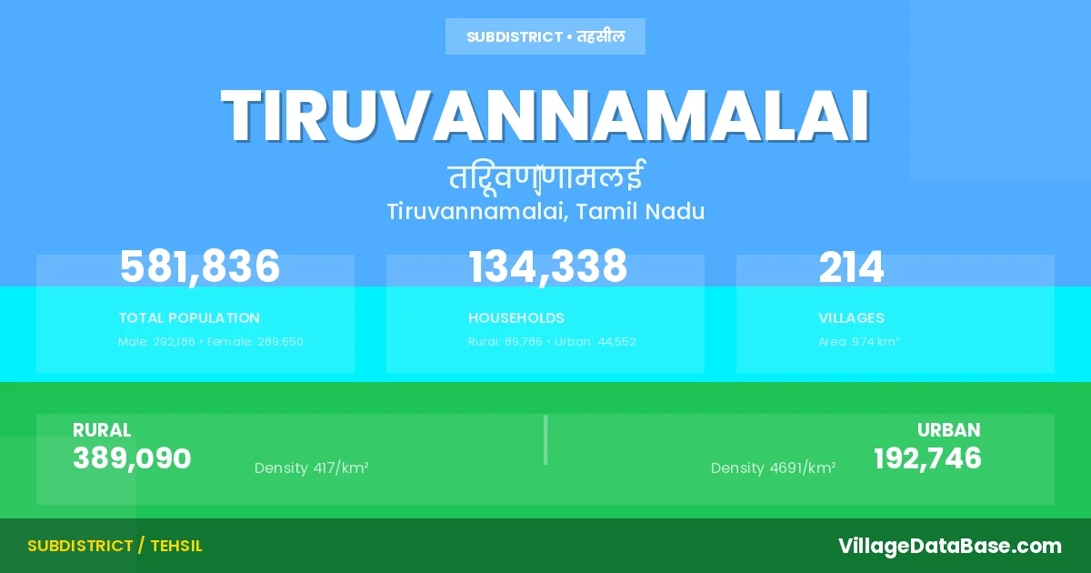 According to the 2011 census The total area of Tiruvannamalai Taluka is 974 km², with a population of 581836 people. The population density is 597 inhabitants per square kilometre, and there are approximately 134338 houses in the sub district.