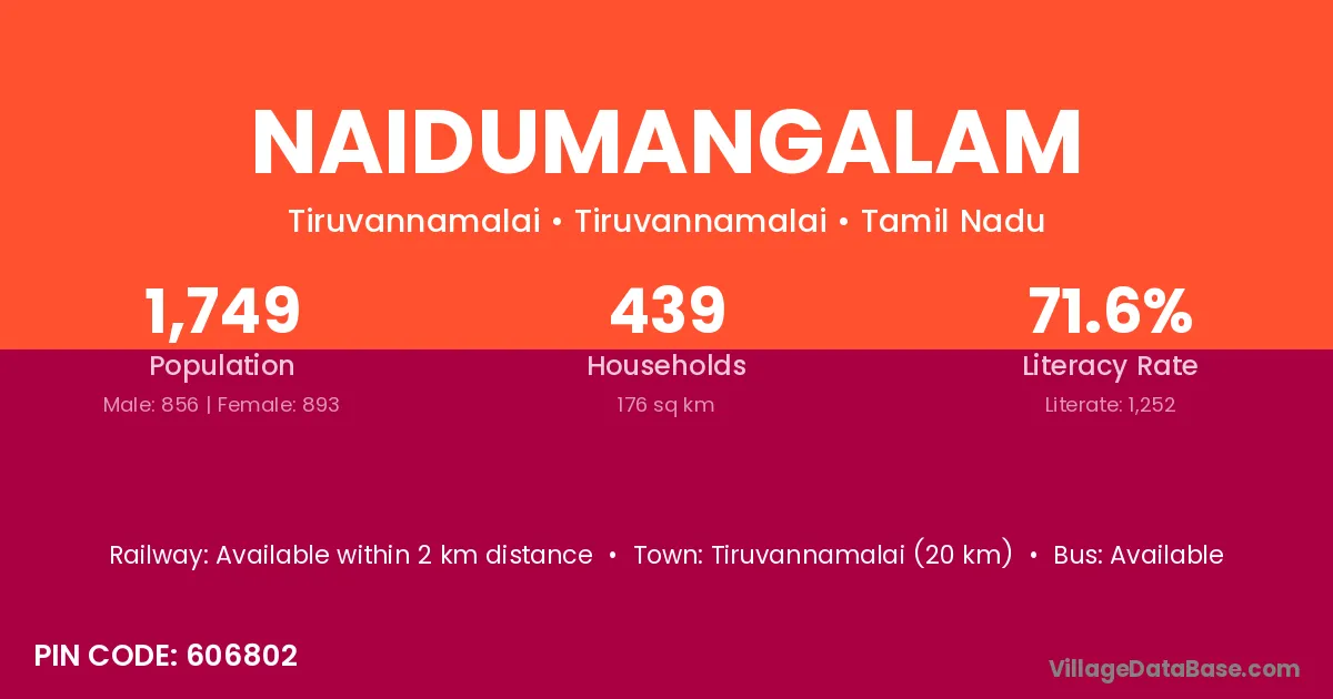 Tiruvannamalai (20 km) is the nearest town to Naidumangalam village for major economic activities and is located approximately 20 km away.