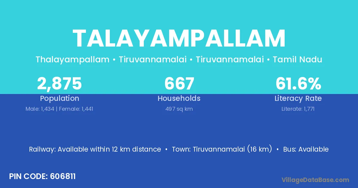 Tiruvannamalai (16 km) is the nearest town to Talayampallam village for major economic activities and is located approximately 16 km away.