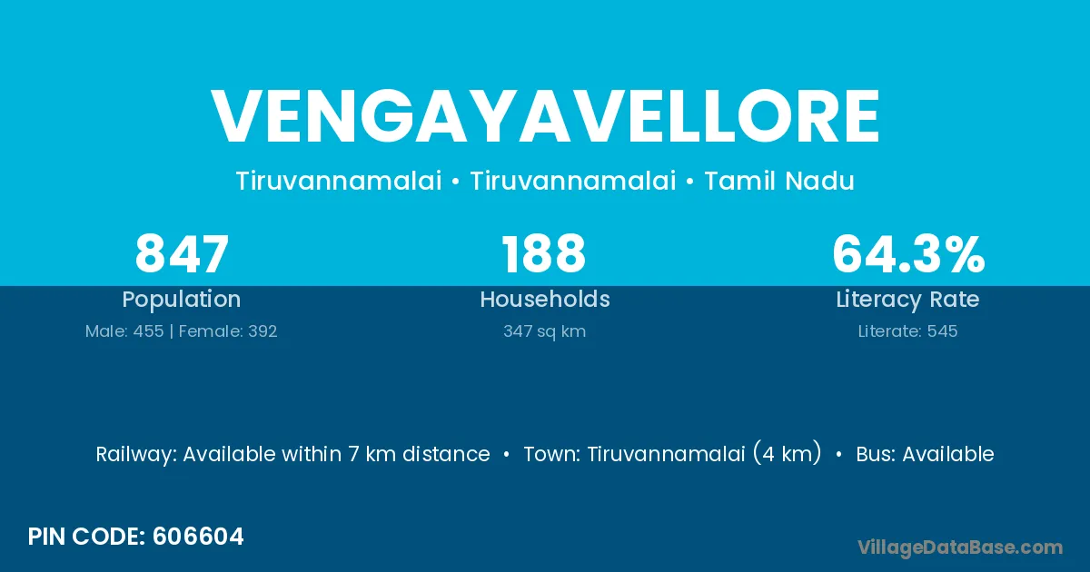 Tiruvannamalai (4 km) is the nearest town to Vengayavellore village for major economic activities and is located approximately 4 km away.