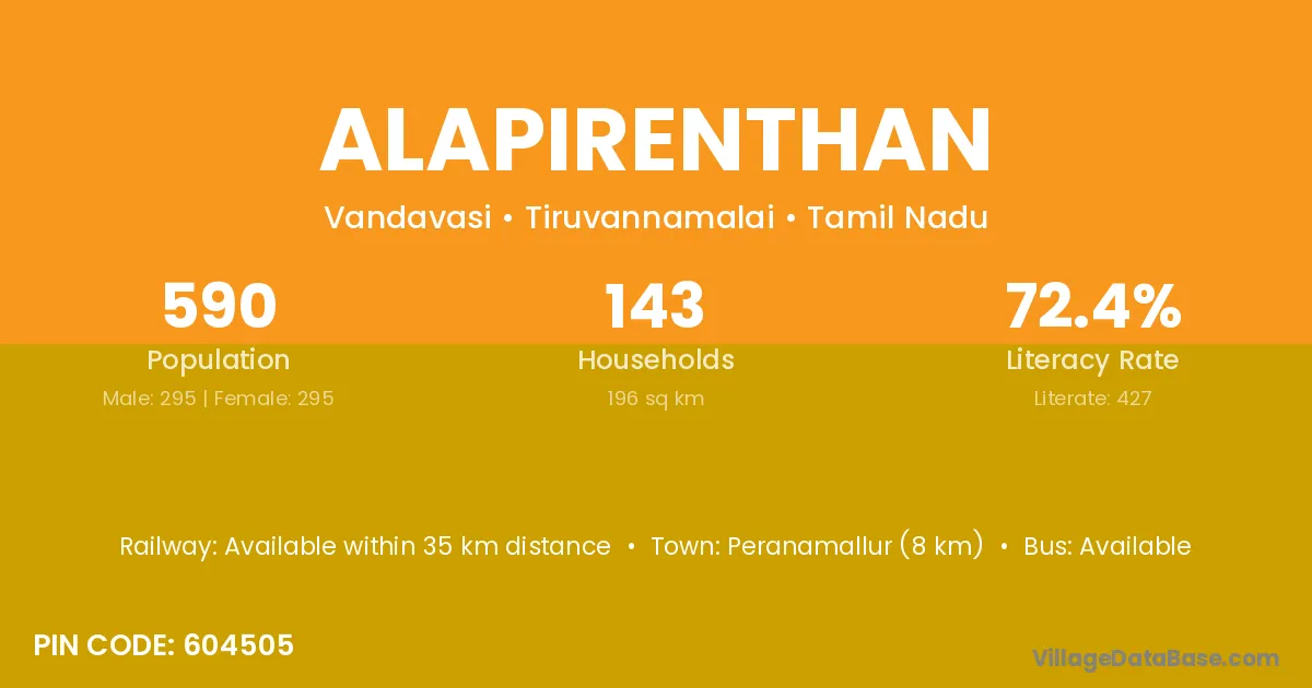 Alapirenthan village has a total population of 590 people, of which 295 are males and 295 are females.