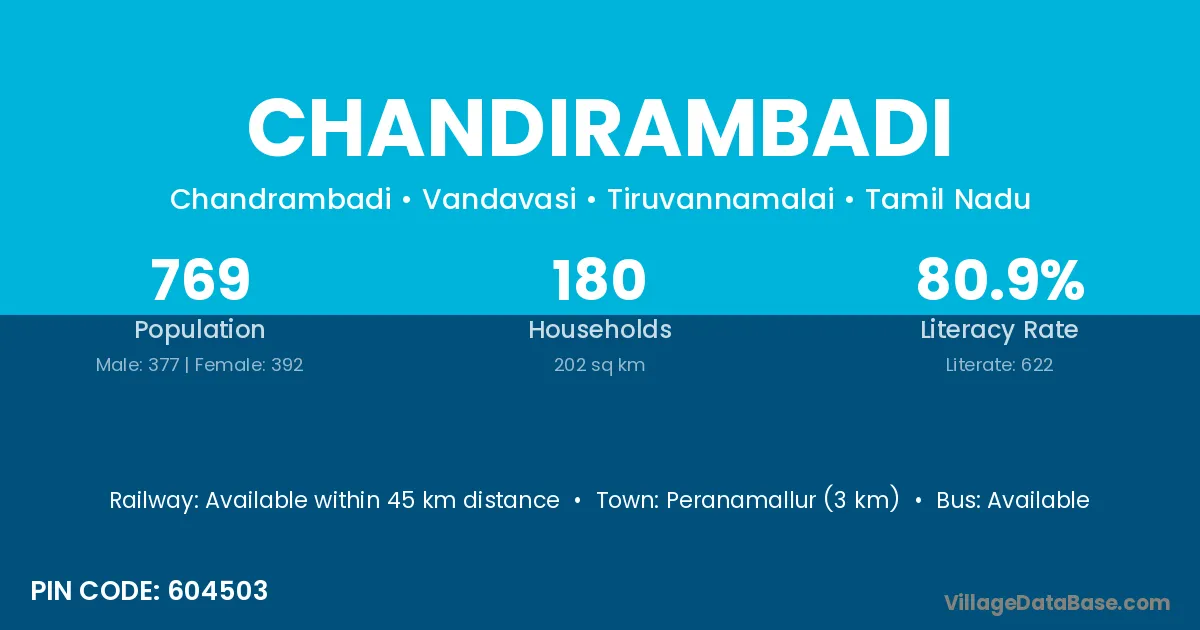Peranamallur (3 km) is the nearest town to Chandirambadi village for major economic activities and is located approximately 3 km away.