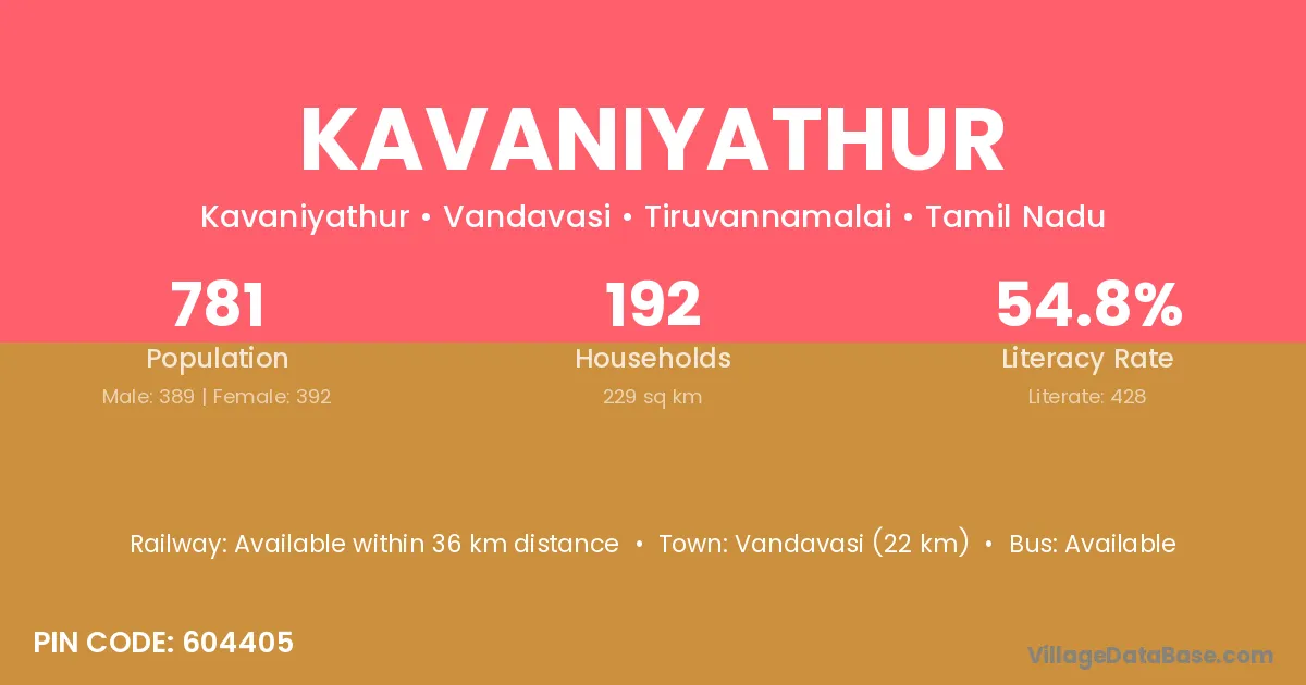 Kavaniyathur village has a total population of 781 people, of which 389 are males and 392 are females.