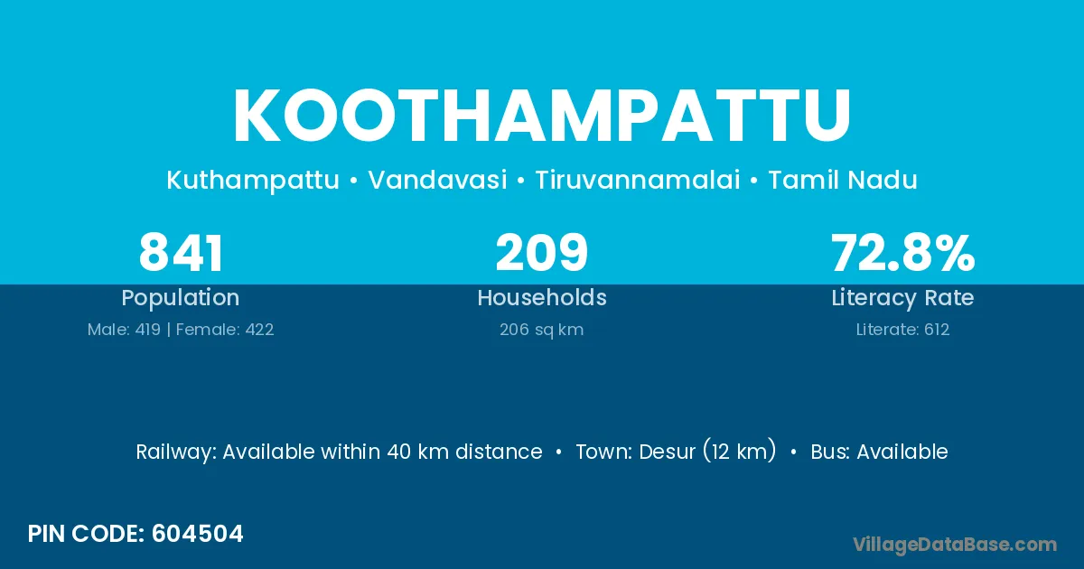 Desur (12 km) is the nearest town to Koothampattu village for major economic activities and is located approximately 12 km away.