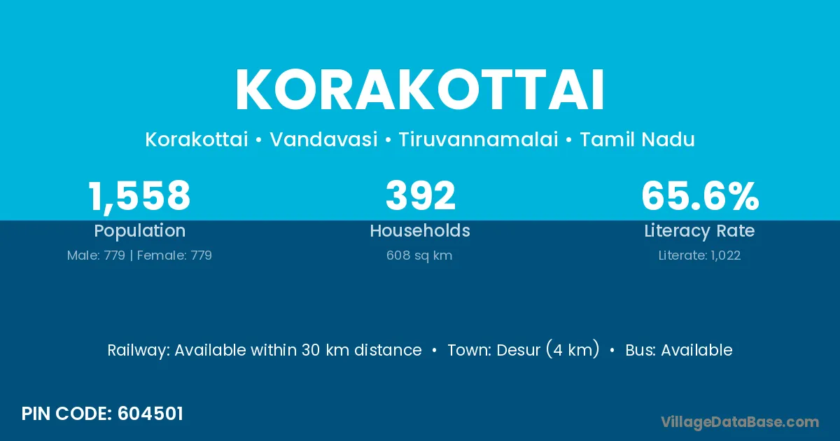 Korakottai village has a total population of 1,558 people, of which 779 are males and 779 are females.