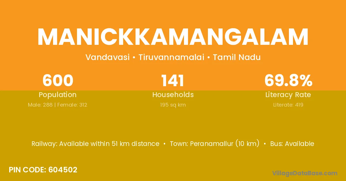 Manickkamangalam village has a total population of 600 people, of which 288 are males and 312 are females.