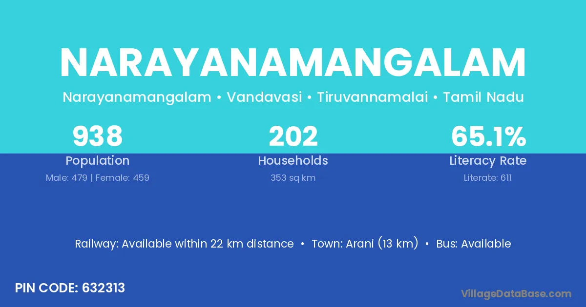 Arani (13 km) is the nearest town to Narayanamangalam village for major economic activities and is located approximately 13 km away.