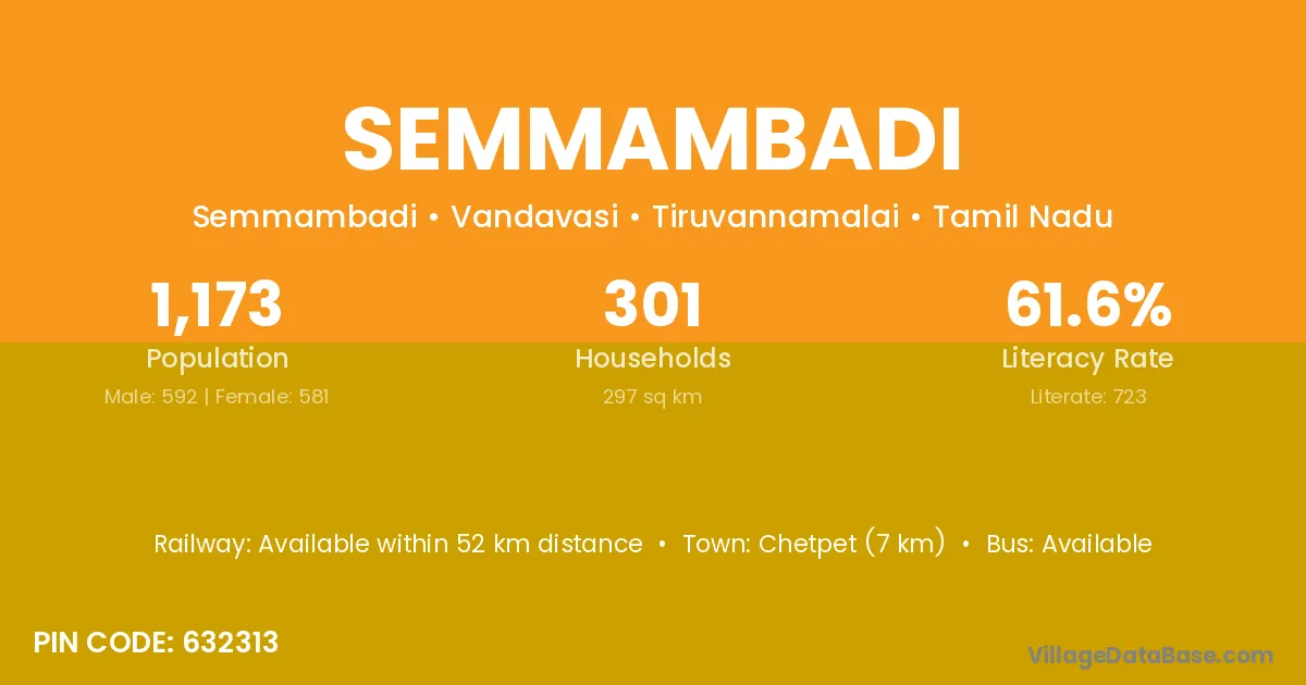 Semmambadi village has a total population of 1,173 people, of which 592 are males and 581 are females.