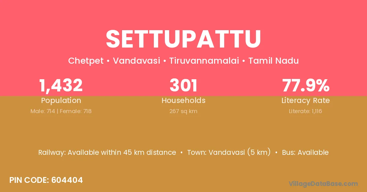 Settupattu village has a total population of 1,432 people, of which 714 are males and 718 are females.