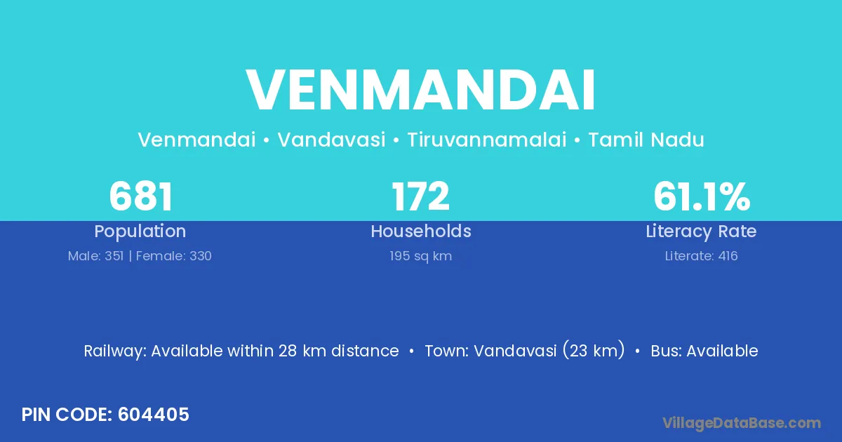 Vandavasi (23 km) is the nearest town to Venmandai village for major economic activities and is located approximately 23 km away.