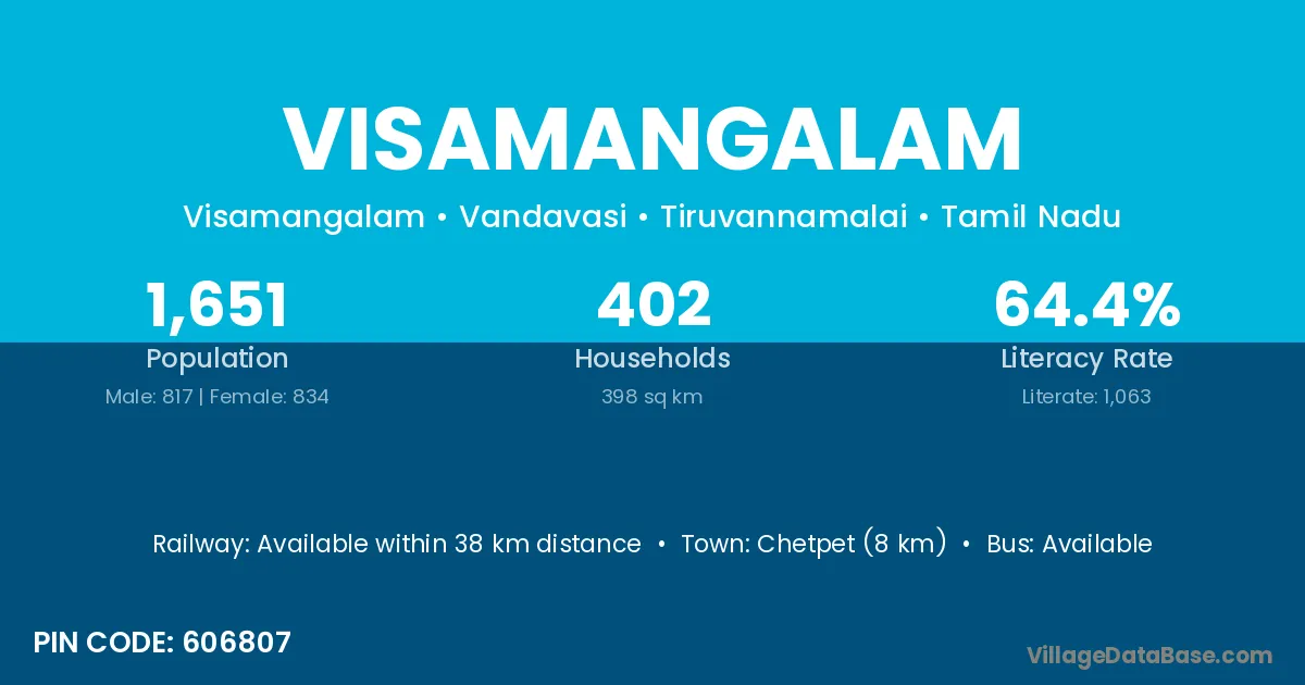 Chetpet (8 km) is the nearest town to Visamangalam village for major economic activities and is located approximately 8 km away.