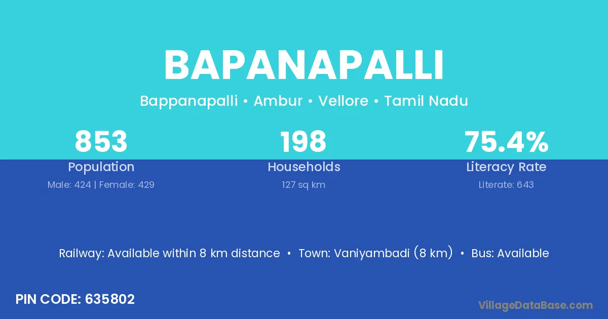 Vaniyambadi (8 km) is the nearest town to Bapanapalli village for major economic activities and is located approximately 8 km away.