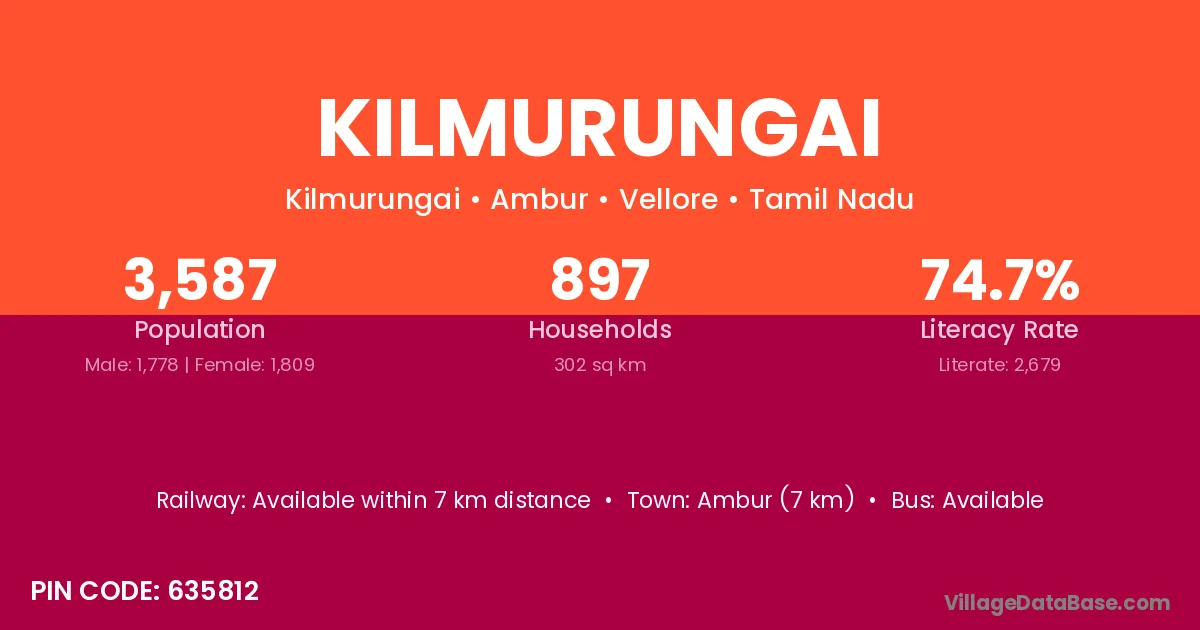 Ambur (7 km) is the nearest town to Kilmurungai village for major economic activities and is located approximately 7 km away.