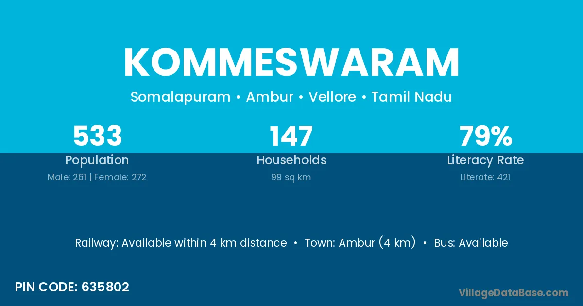 Ambur (4 km) is the nearest town to Kommeswaram village for major economic activities and is located approximately 4 km away.