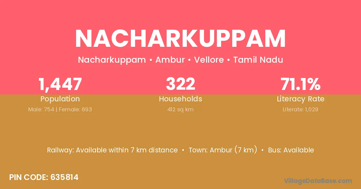 Ambur (7 km) is the nearest town to Nacharkuppam village for major economic activities and is located approximately 7 km away.