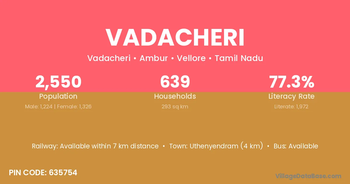 Uthenyendram (4 km) is the nearest town to Vadacheri village for major economic activities and is located approximately 4 km away.