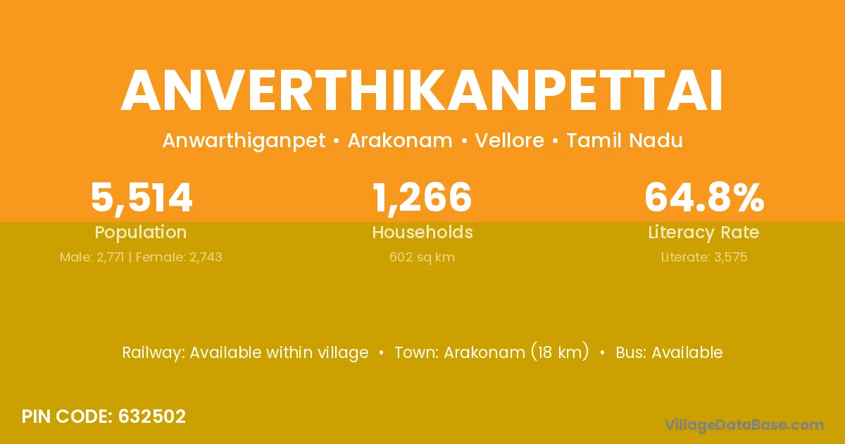 Arakonam (18 km) is the nearest town to Anverthikanpettai village for major economic activities and is located approximately 18 km away.