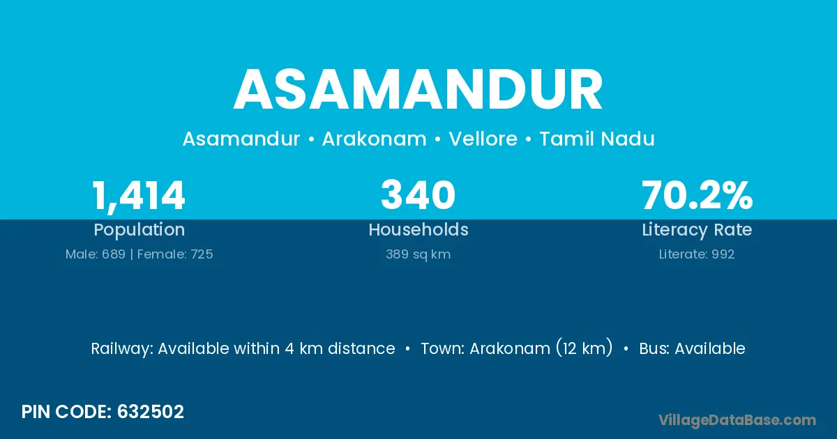 Arakonam (12 km) is the nearest town to Asamandur village for major economic activities and is located approximately 12 km away.