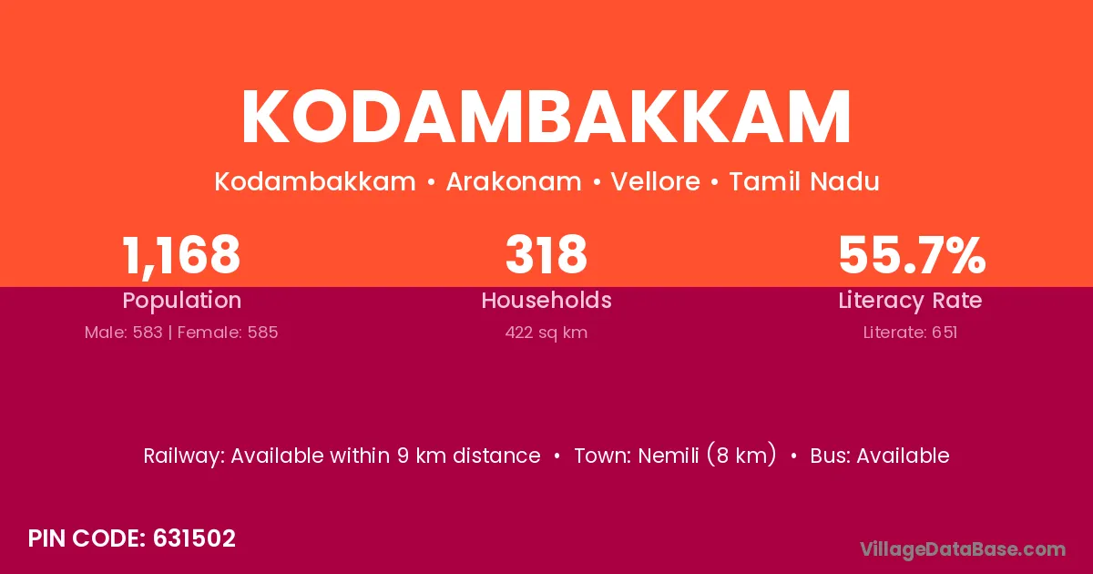 Kodambakkam village has a total population of 1,168 people, of which 583 are males and 585 are females.