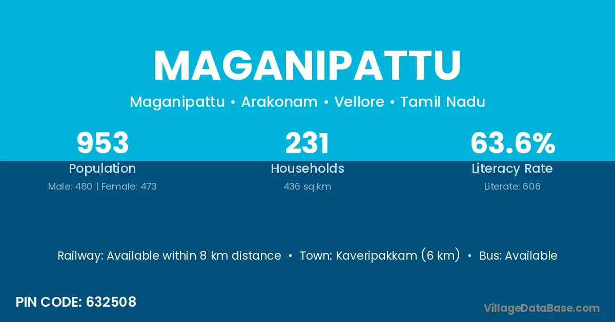Maganipattu village has a total population of 953 people, of which 480 are males and 473 are females.