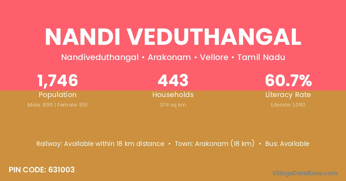 Arakonam (18 km) is the nearest town to Nandi Veduthangal village for major economic activities and is located approximately 18 km away.