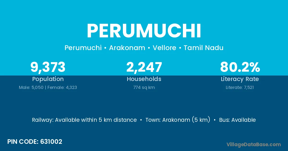 Arakonam (5 km) is the nearest town to Perumuchi village for major economic activities and is located approximately 5 km away.