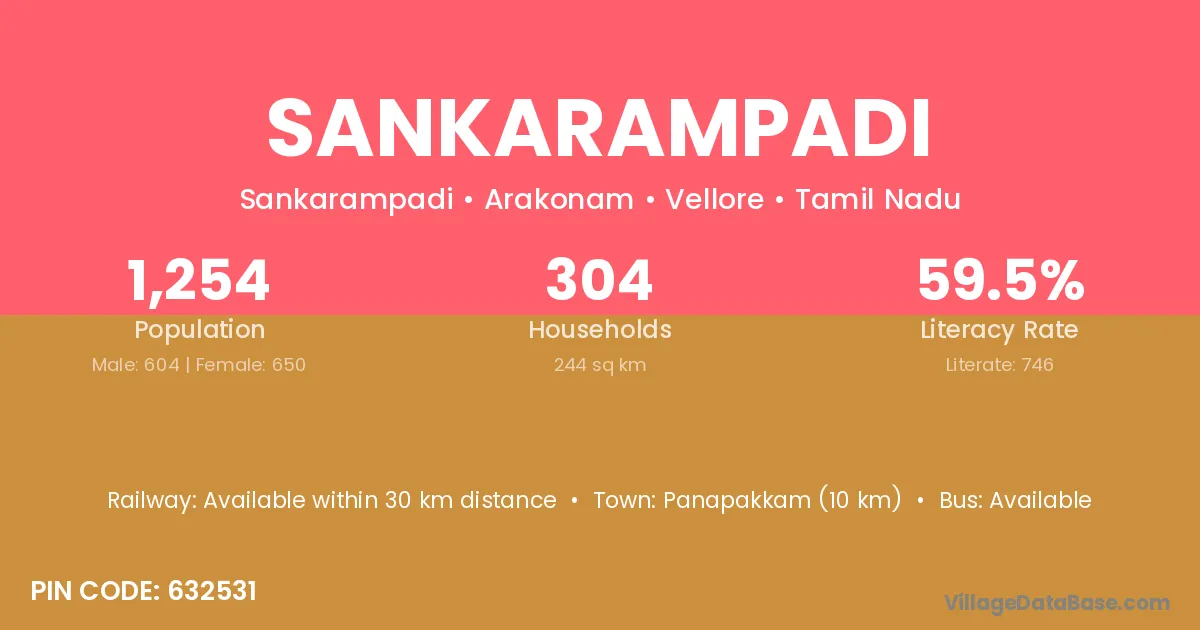 Sankarampadi village has a total population of 1,254 people, of which 604 are males and 650 are females.