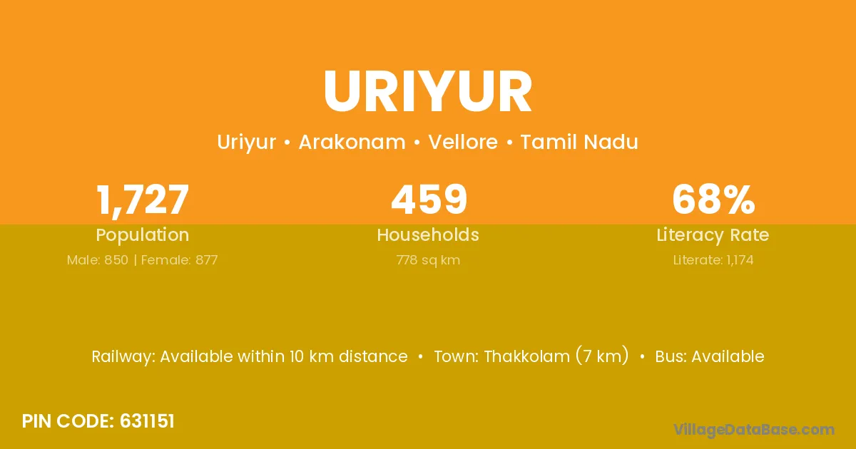 Thakkolam (7 km) is the nearest town to Uriyur village for major economic activities and is located approximately 7 km away.