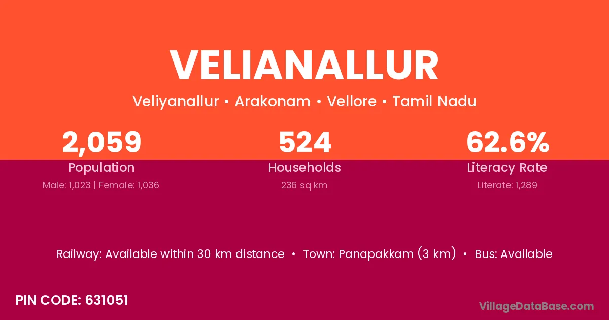 Panapakkam (3 km) is the nearest town to Velianallur village for major economic activities and is located approximately 3 km away.
