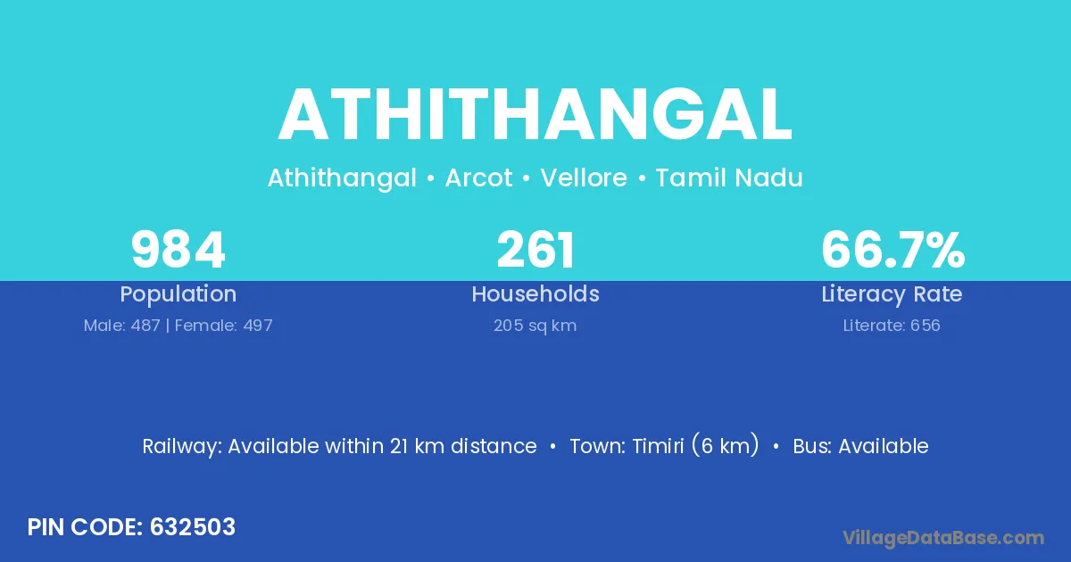 Timiri (6 km) is the nearest town to Athithangal village for major economic activities and is located approximately 6 km away.