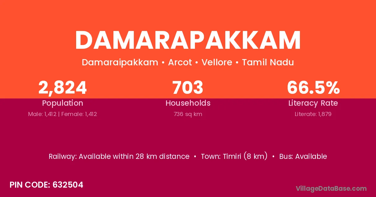 Timiri (8 km) is the nearest town to Damarapakkam village for major economic activities and is located approximately 8 km away.