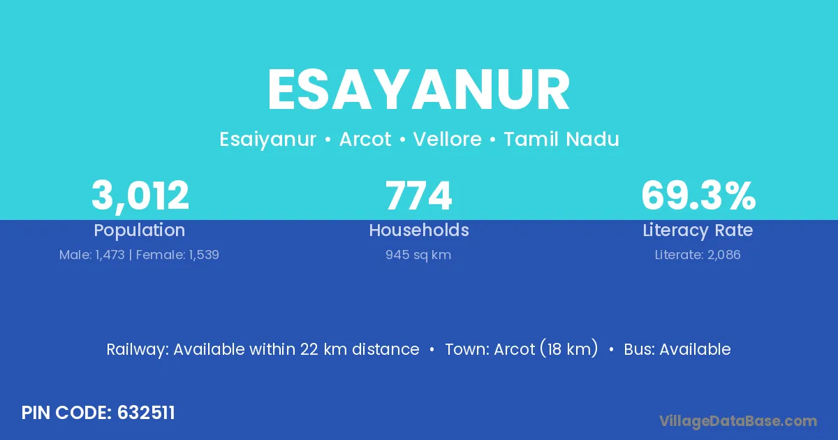 Arcot (18 km) is the nearest town to Esayanur village for major economic activities and is located approximately 18 km away.