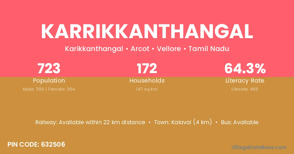 Kalavai (4 km) is the nearest town to Karrikkanthangal village for major economic activities and is located approximately 4 km away.