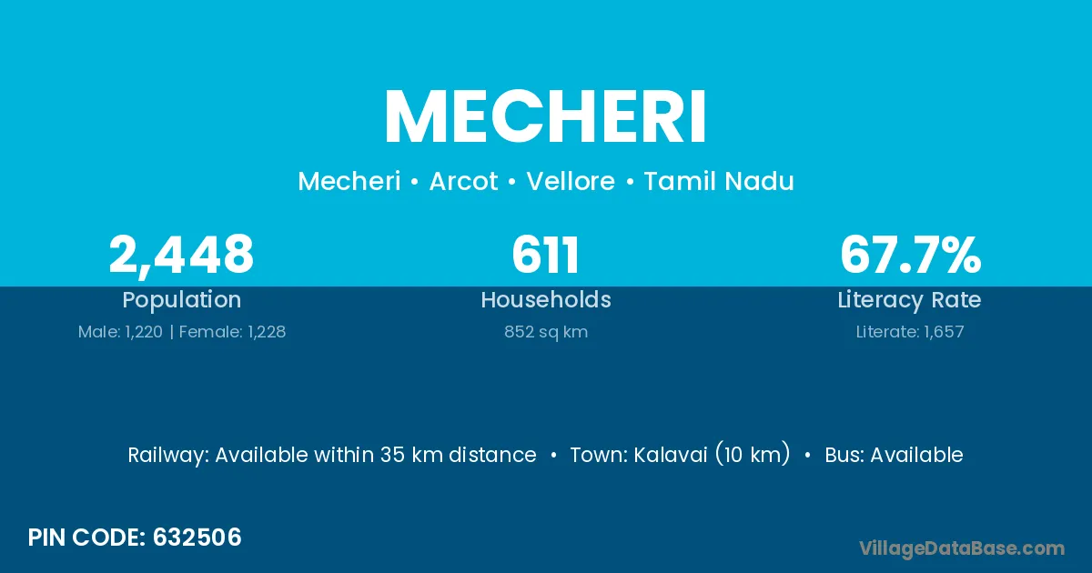 Kalavai (10 km) is the nearest town to Mecheri village for major economic activities and is located approximately 10 km away.