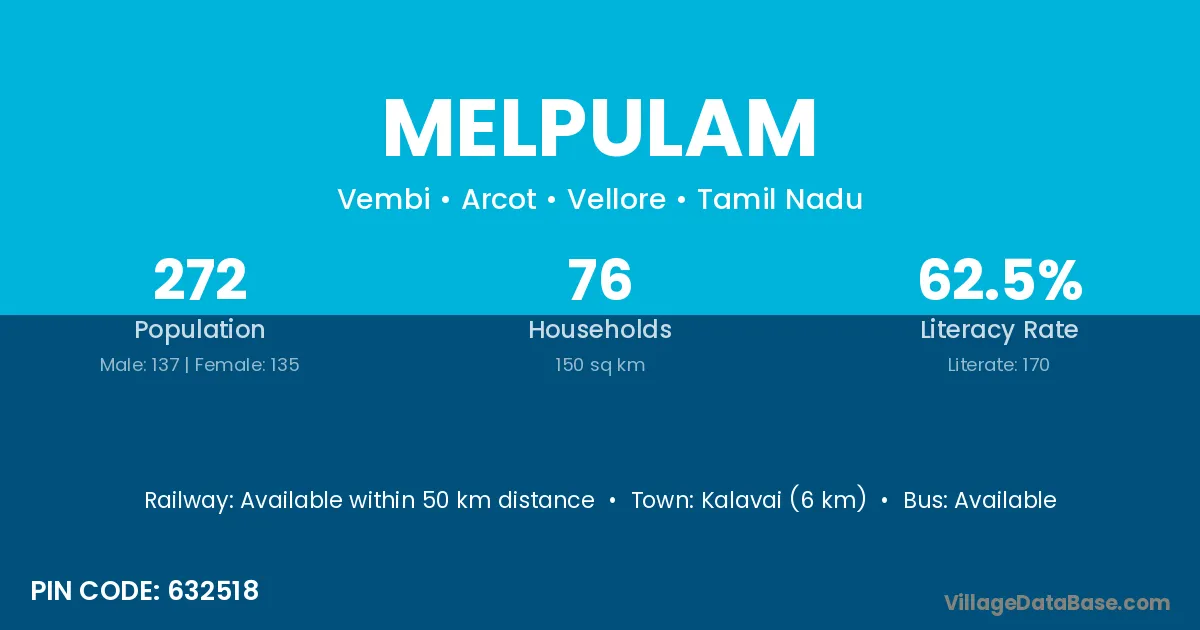 Kalavai (6 km) is the nearest town to Melpulam village for major economic activities and is located approximately 6 km away.